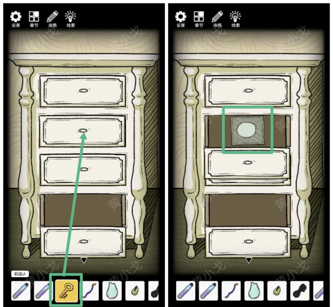 2.(柜子)点击柜子,用【钥匙A】打开第二个上锁的抽屉,获得【石棉网】