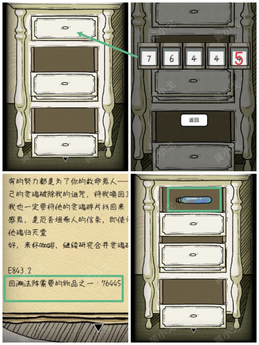 3.点击第一个上锁的抽屉,根据笔记本上的线索,输入密码:76445。打开抽屉,获得【混合药剂D】