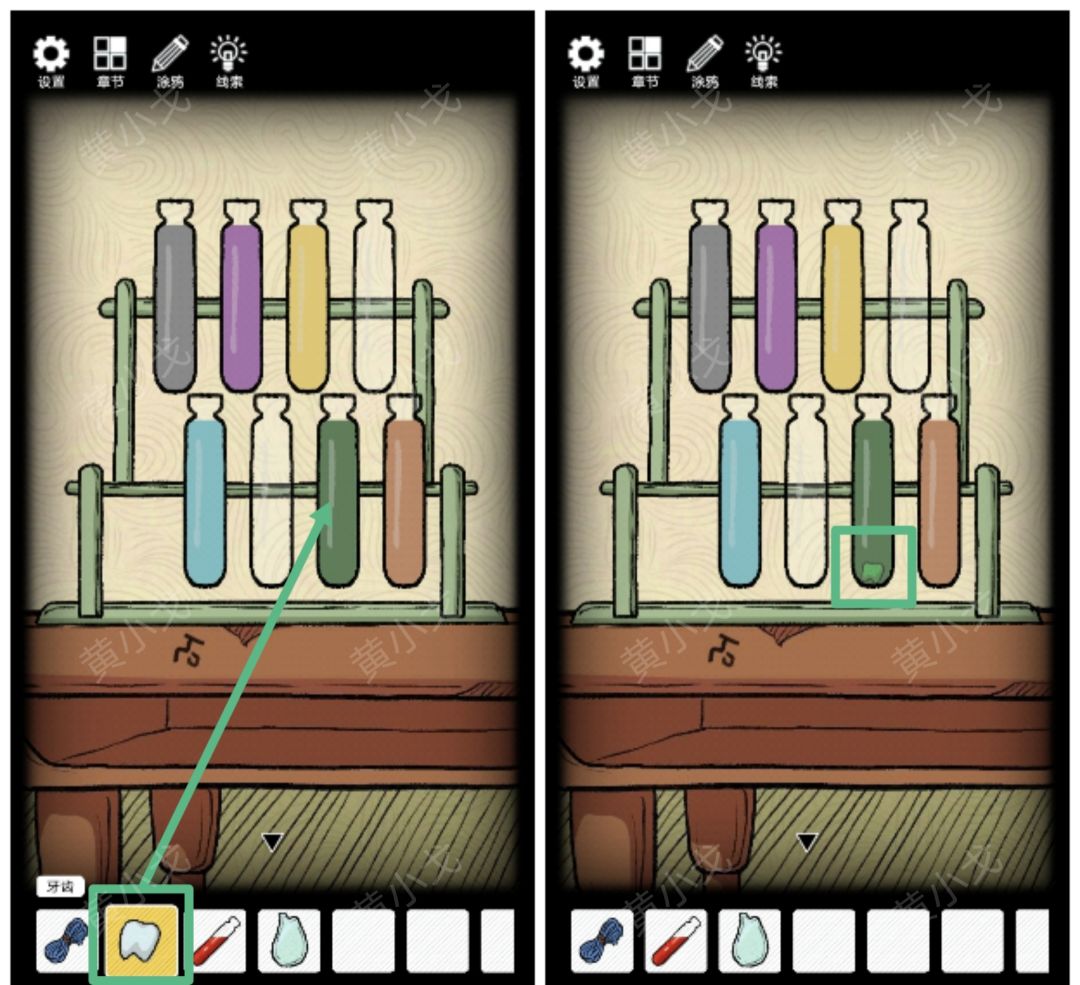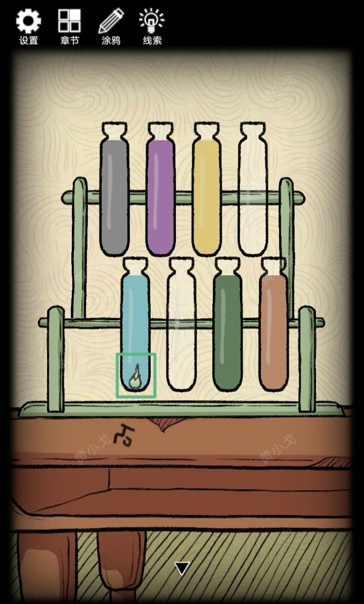8.点击试管架,完成移动药剂小游戏(分离药剂)(注意看桌子上的符文及颜色-褐色);点击获取红色试管的【生命精华】