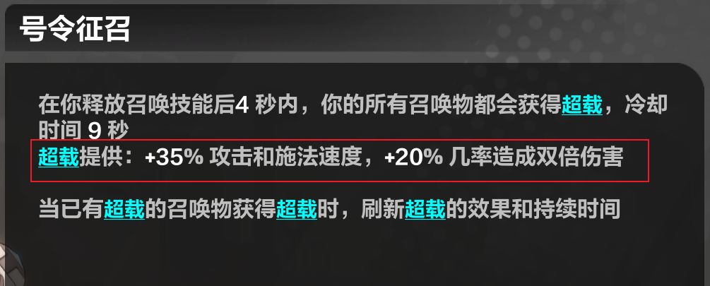 超载效果:额外5%攻速,额外15%召唤物伤害 额外3倍超载效果