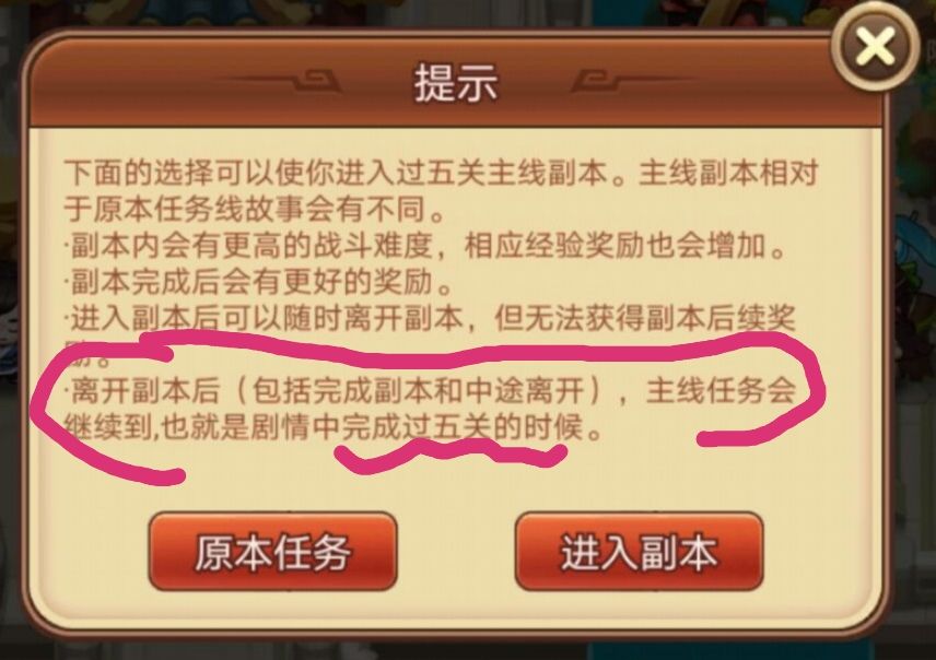 在最新更新的4341版本中,在拯救大兵关羽的任务里,和关羽对话完,会出现下图一的副本选择对话框,可以选择原有剧情过五关,或者选择新的剧情过五关。但经过测试,新的剧情过五关,消耗体力比原有更多,奖励也不够丰厚,所以新的过五关也不值得做。但在更新的对话框中提示,无论什么时候离开副本,剧情都将发展到完成五关的时候,见下图一红色部分。所以,