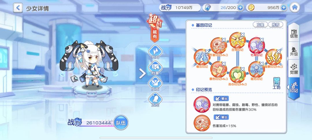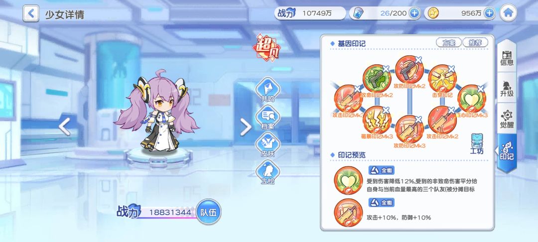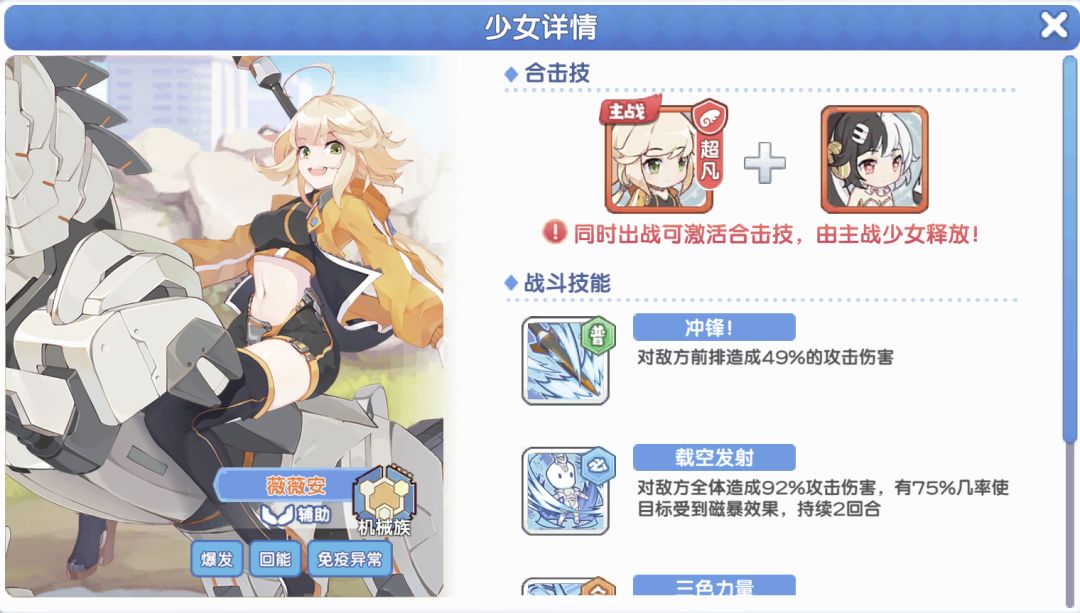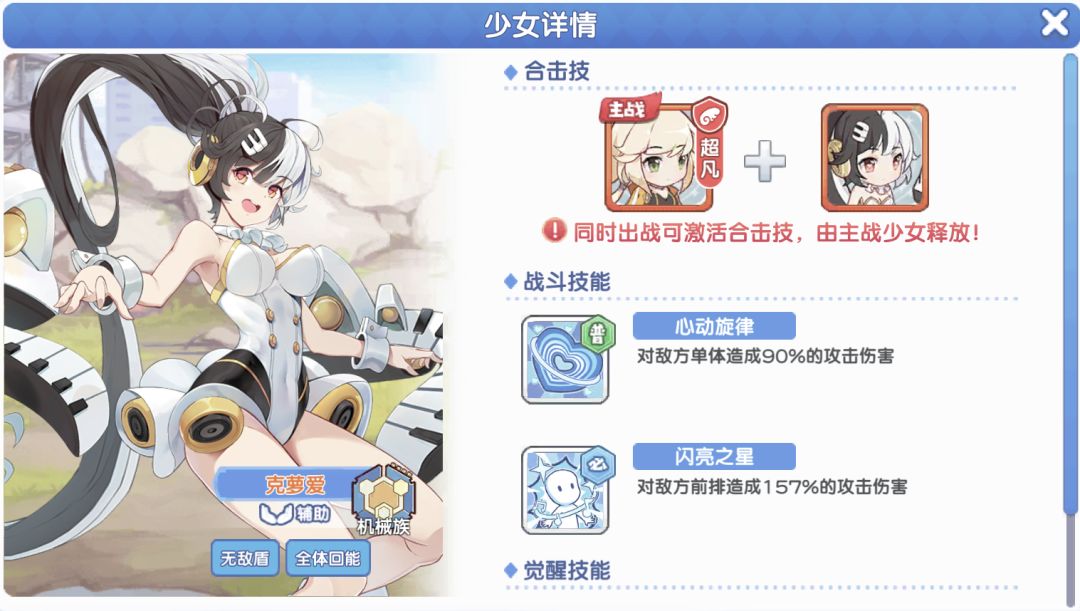 来自机械的天才音乐少女,比较百搭的辅助,兼具增伤、回能解控能力,心3拥有质变效果,可以使同阵营少女%80概率行动一次。非常推荐培养的少女啦~