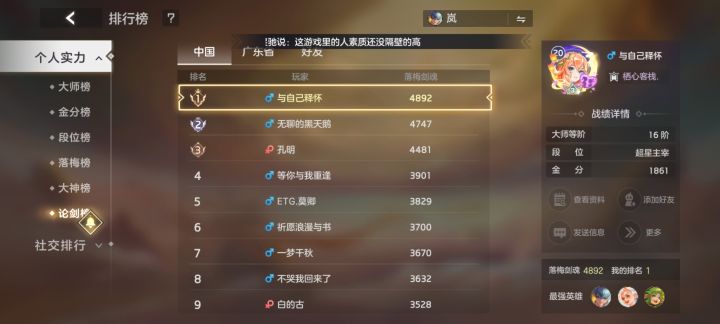 中路:我的定位是支援-消耗型中核,我一般是走中路,因为岚的被动(五只风燕,每个提供1.5%的移速加成(削到1%了)),清完线支援上下路方便很多,然后带个审判方便团战收割,砖石段位以下的直接对线中路(因为这个段位的一般都会上头),一技能+点a对面,升二了加三技能跟上晕眩+审判收割。