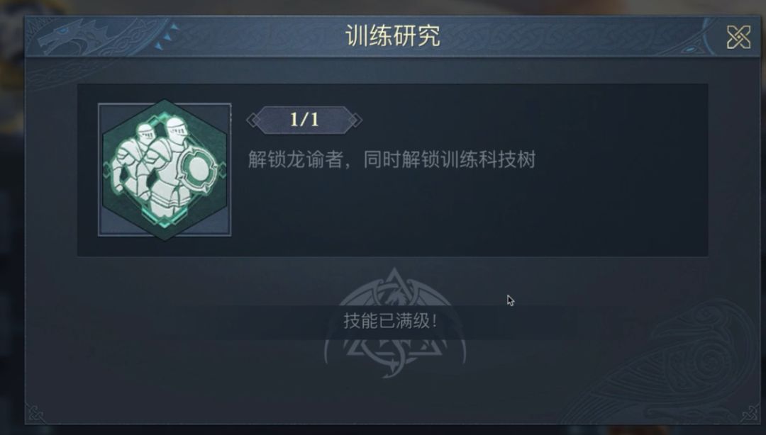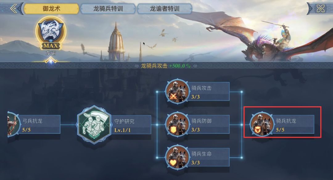 御龙术是线性科技树,要分别点出各系兵种强化科技,再点出“训练研究”后才可解锁龙谕者及相应科技树。