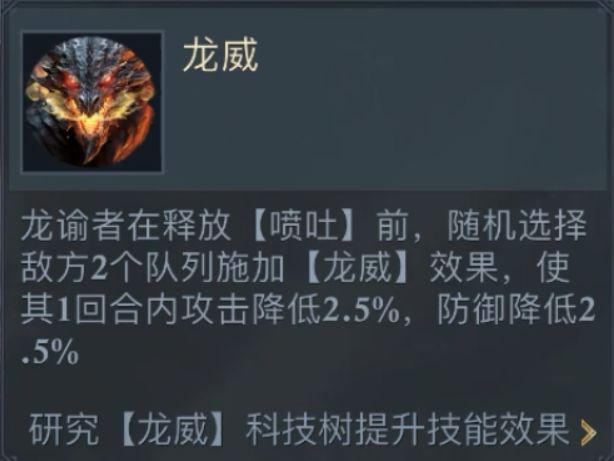发起攻击前释放龙威,随机降低敌方2个队列部队的攻击和防御,这样喷吐更容易打出高额伤害。