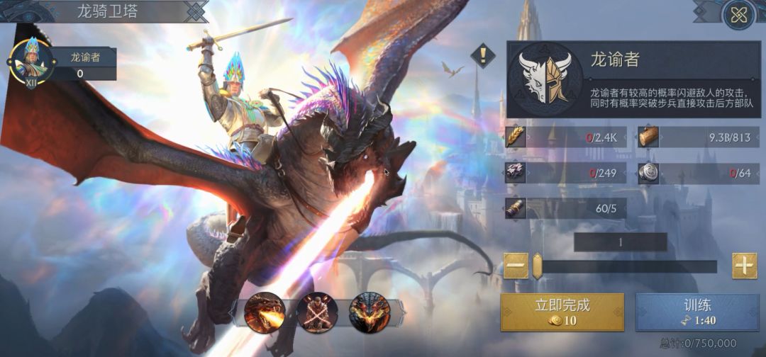 龙谕者的部队能力数值与御龙科技有关,点满龙骑攻击、龙骑防御、龙骑增伤等科技,可有效提升龙谕者战力数值;另外我们也可以在御龙科技中点出相应的“抗龙”科技,来提升常规兵种对龙骑兵的抗性。