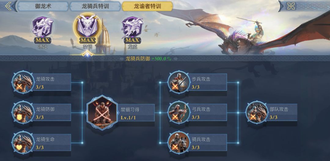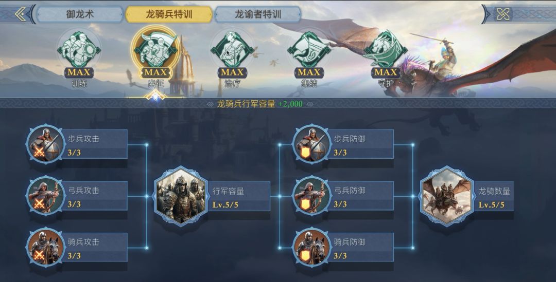 三大天赋树学习后都可大幅提升部队战力以及定向提升龙骑兵相关能力,尽可能收集相应资源,提升御龙科技可有效提升部队战力。