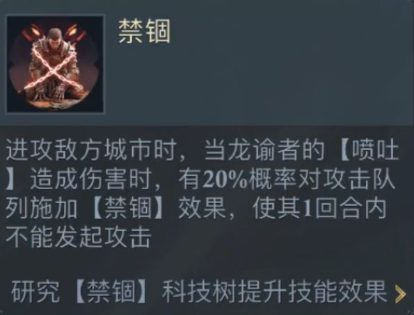 攻城战斗内,喷吐造成伤害的同时,还可对伤害目标队列施加禁锢,使其不能发动攻击;禁锢主要作用于攻城战斗,禁锢敌方“后排队列”,可有效限制其输出。