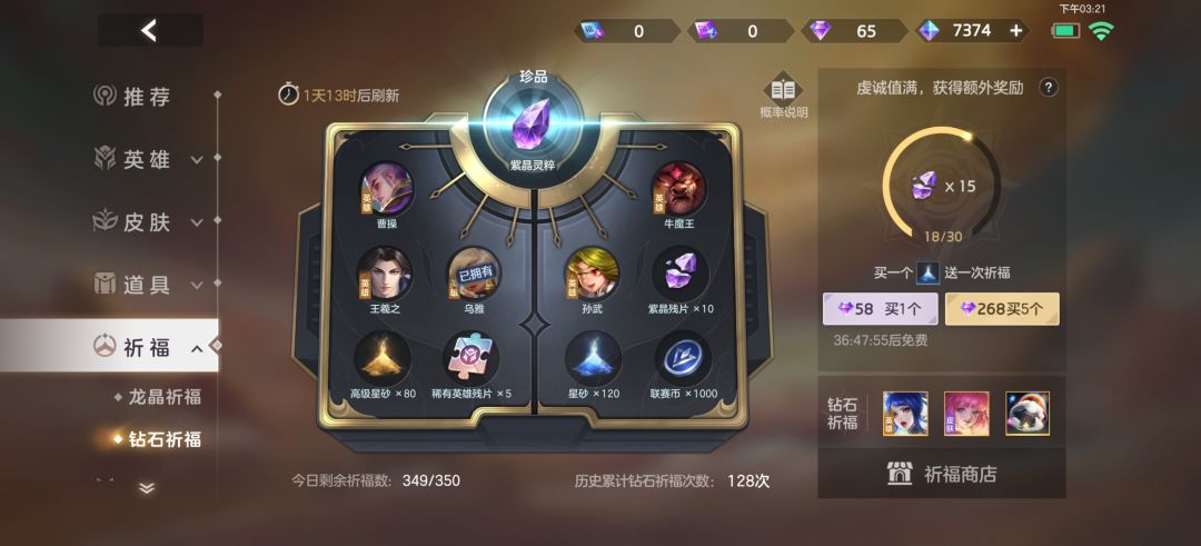 21.钻石可以买商城的商保箱,周限购20,可以开出英雄碎片、播报碎片,感觉蛮划算了,看个人。