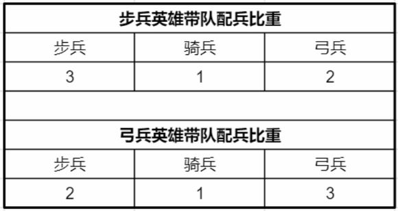 大家可以参考下这个配兵思路,基础可遵循3:2:1的配兵思路。由于每个兵种有2种类型的士兵,我们可以进行1:1或2:1的配置。除了常规配队思路外,也可根据敌人的兵力配置进行调整。