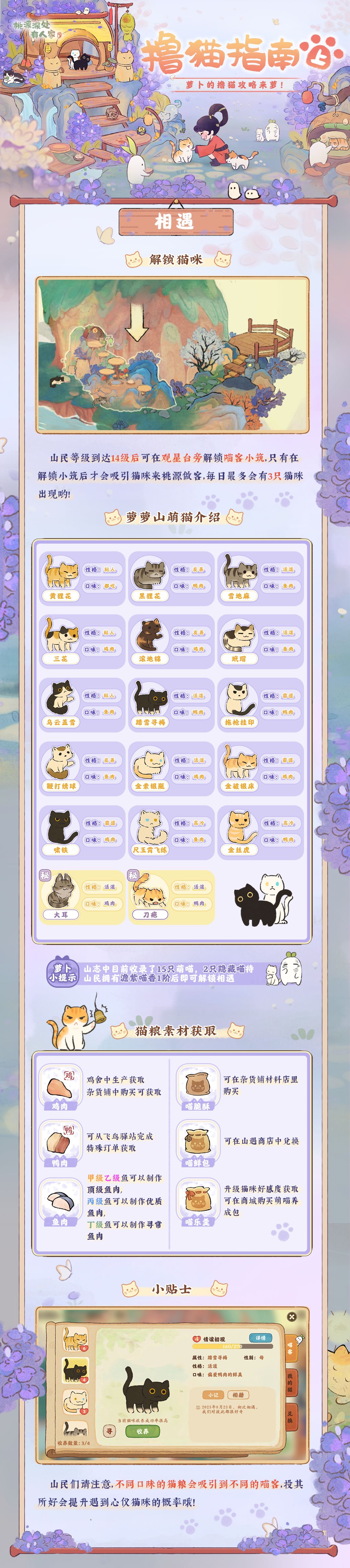小萝卜给山民带来了「撸猫指南」第2期内容“相知”,介绍了与萌喵的好感互动以及收养...