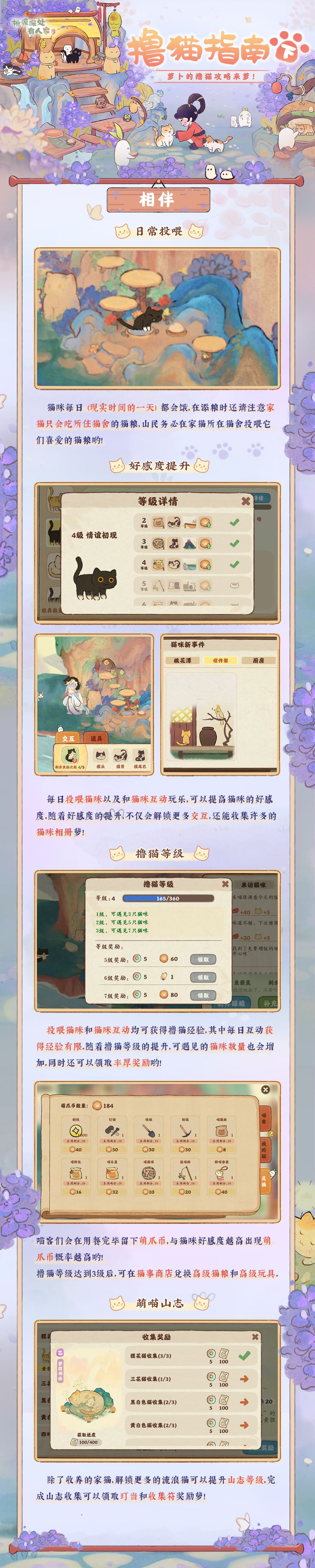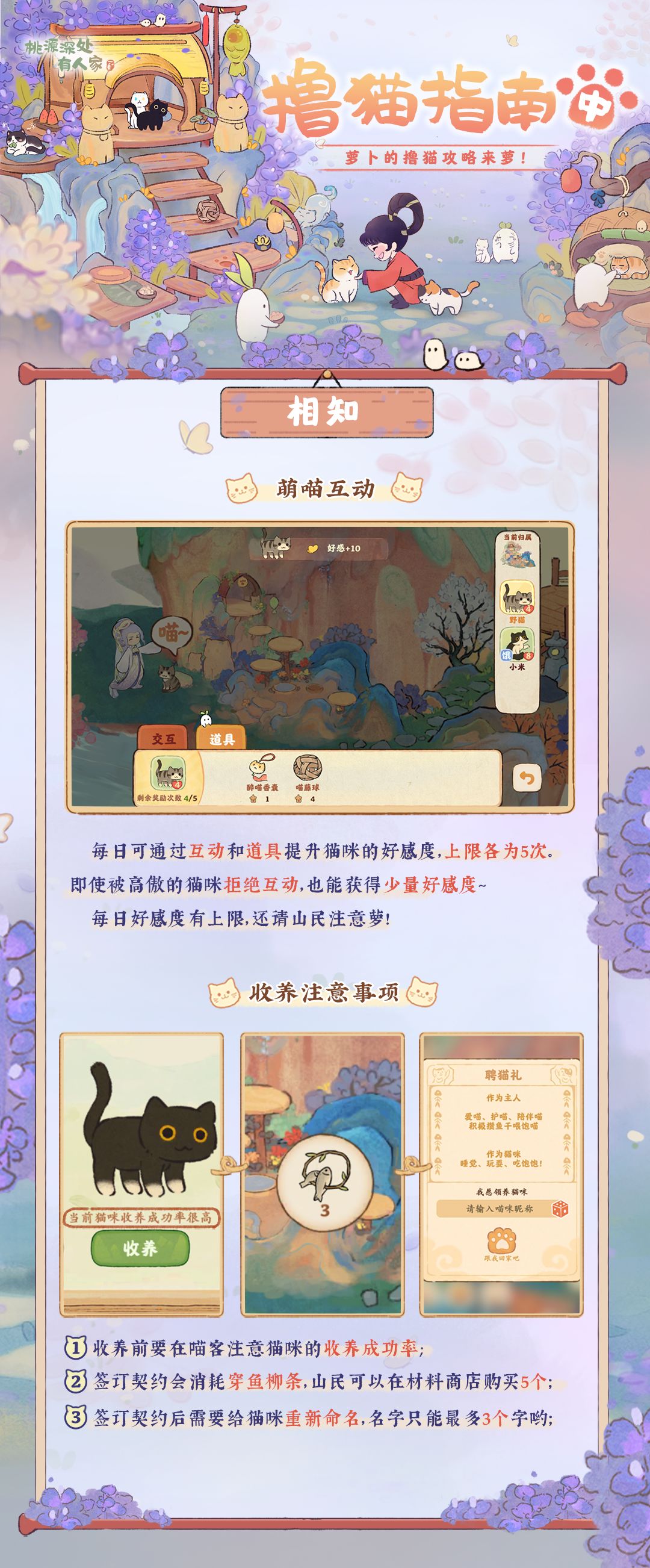 小萝卜给山民带来了「撸猫指南」第2期内容“相知”,介绍了与萌喵的好感互动以及收养...