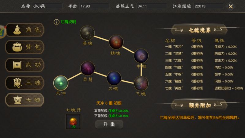 注:七魄全部达到满级后额外附加百分之5的全部属性!