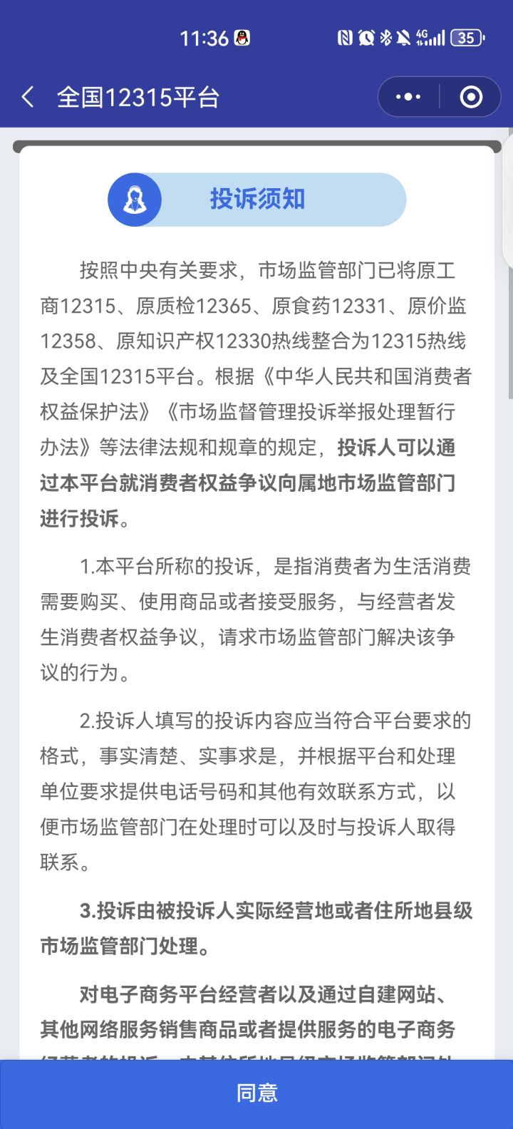 二、点击我要投诉,然后点击同意,跳转到选择投诉单位的界面。
