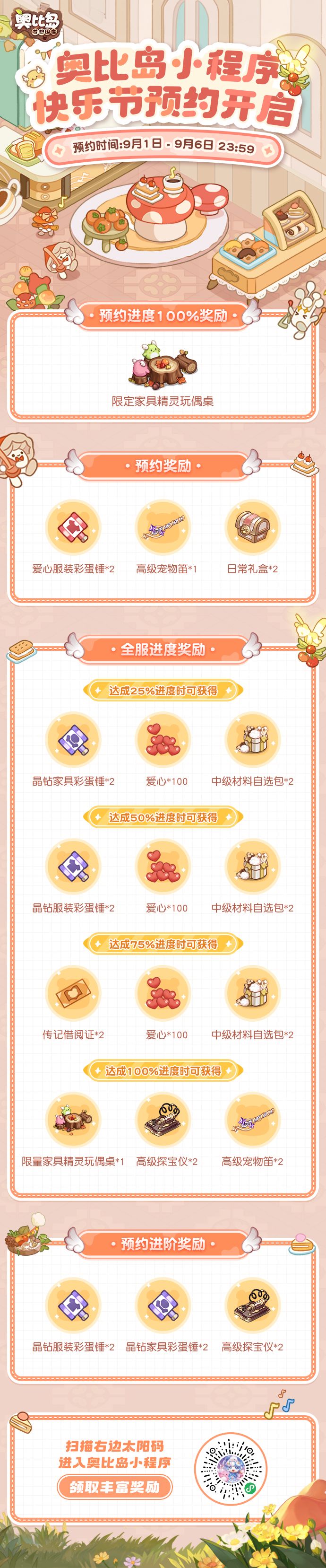 9月1日-9月6日23:59期间,成功预约新版本即可获得「爱心服装彩蛋锤*2、高级宠物笛*1、日常礼盒*2」奖励,成功召唤3个小伙伴一起预约,还可获得进阶奖励「晶钻服装彩蛋锤*2,晶钻家具彩蛋锤*2,高级探宝仪*2」,小奥比快快分享给好友,一起预约领好礼!