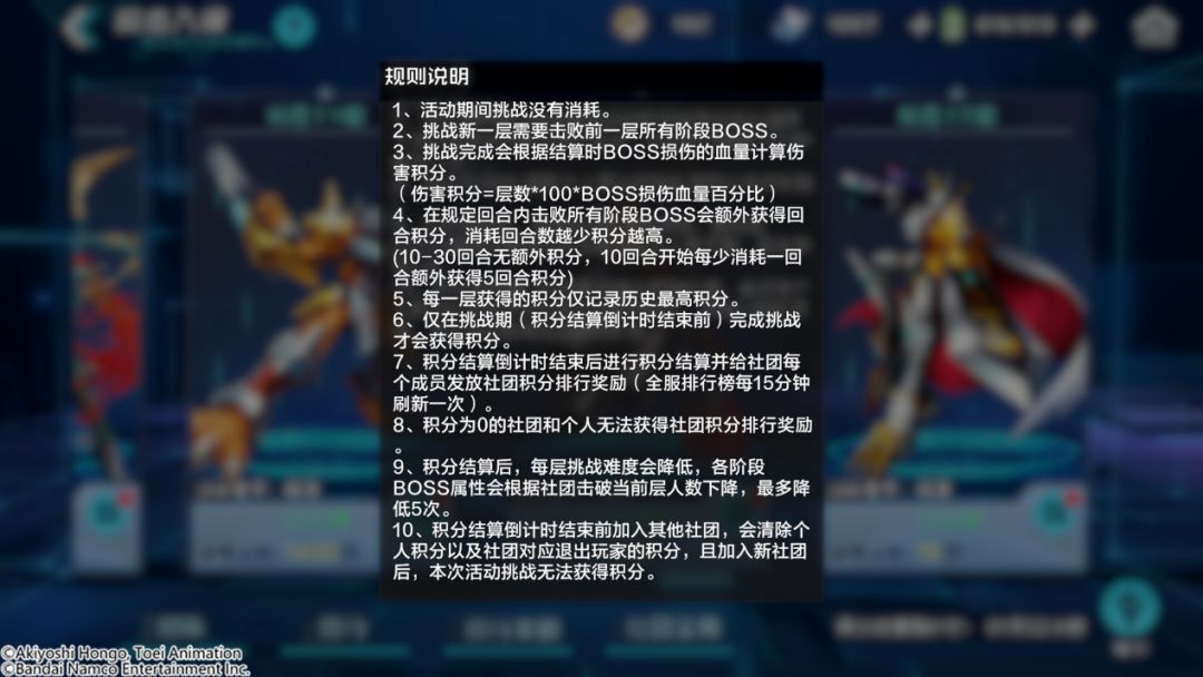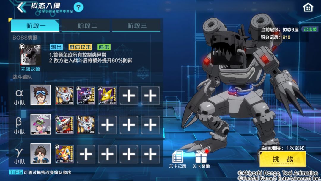 挑战过程中,您需要一次上阵三个队伍进入战斗,按照队伍先后顺序依次与同一层三个阶段的敌人进行对战。同时,队伍内的数码宝贝需要18资质以上才可出战。