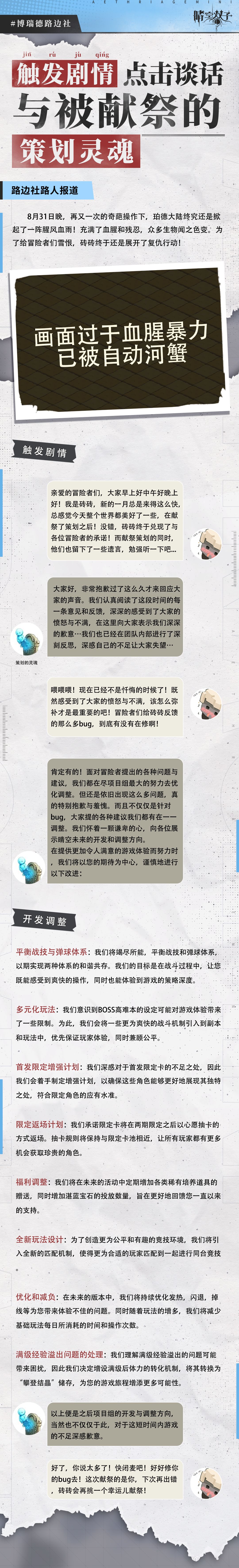 砖砖再次代表全体制作组向各位表达最诚挚的歉意!十分抱歉!其实,砖砖在与大家沟通的过程中,也总担心建议反馈都不够及时,给冒险者们的福利也还不够多,但砖砖只希望能在陪伴大家的日子中,给到大家带来最好的游戏体验感受。