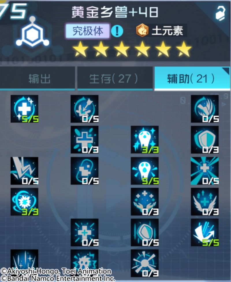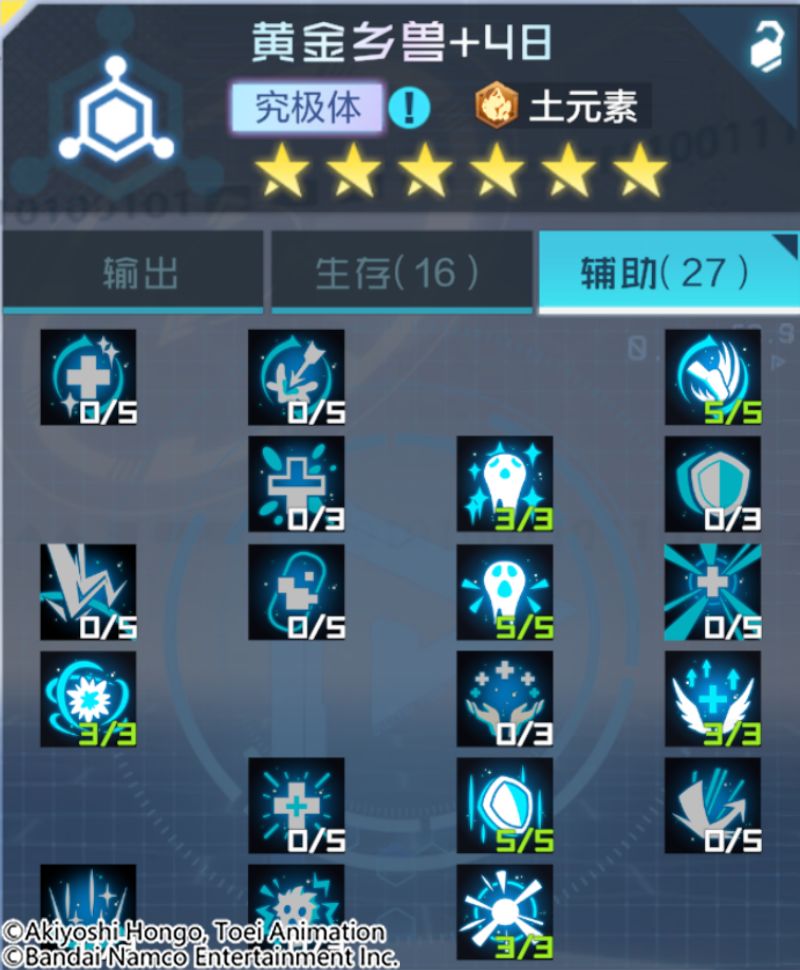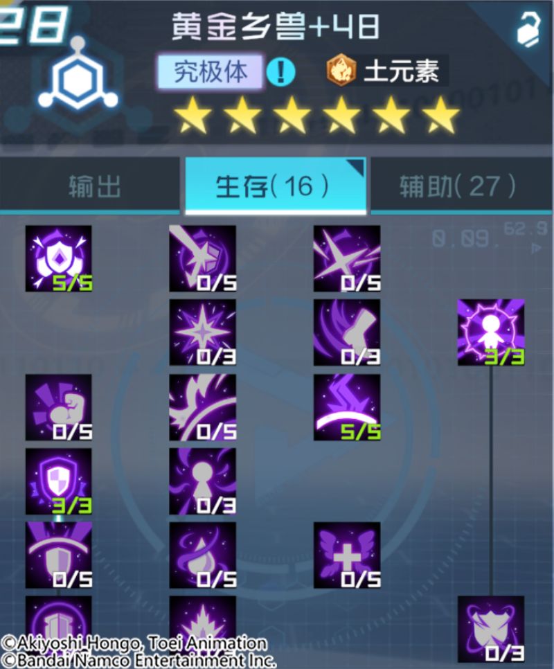 黄金乡兽是兼具辅助与生存能力的土元素数码宝贝。奥义技是攻击敌方全体,为我方全体赋予韧性、防御增益,并且为我方全体赋予反击状态,土元素数码宝贝有几率被赋予磁化标记。得意技是攻击敌方单体,有几率偷取目标随机增益状态并赋予自身以及我方攻击力最高的目标。被动是增加自身速度和最大生命值。自身存活时,与磁化标记下的友方分摊受到的直接伤害,同时赋予我方抗暴光环,对土元素数码宝贝有更多的加成。