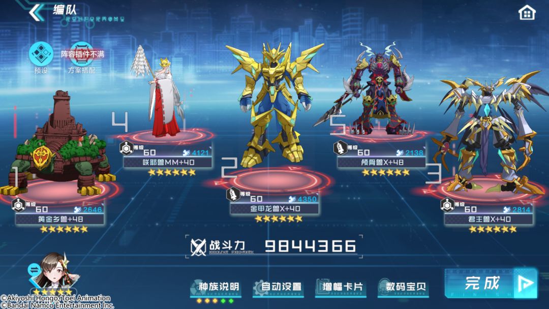 编队特色:黄金乡兽能够为全队提供较高的防御和韧性增益,能够大幅提升金甲龙兽X的护盾效果以及君主兽X的输出能力;颅骨兽X能够对敌方最有威胁的目标赋予决斗标记,变相提高友方队伍生存能力;咲耶兽MM作为集增益、治疗、复活于一体的辅助,是攻关副本的不二人选。