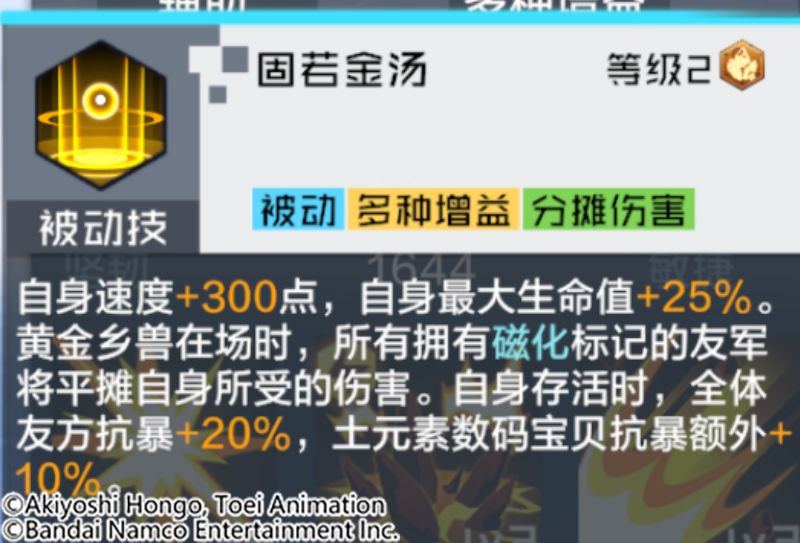 技能解析:增加自身速度和最大生命值。自身存活时,与磁化标记下的友方分摊受到的直接伤害,同时赋予我方抗暴光环,对土元素数码宝贝有更多的加成。