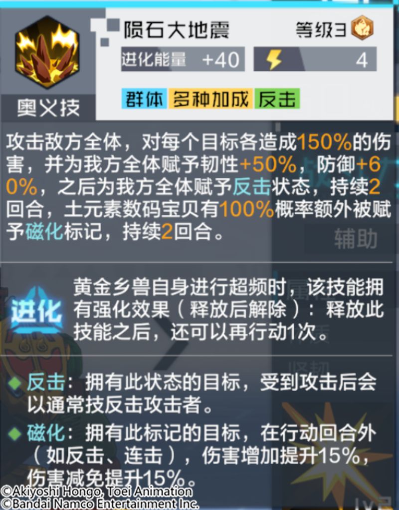 技能解析:攻击敌方全体,为我方全体赋予防御和韧性增益,并且赋予反击状态,土元素数码宝贝有几率被赋予磁化标记。