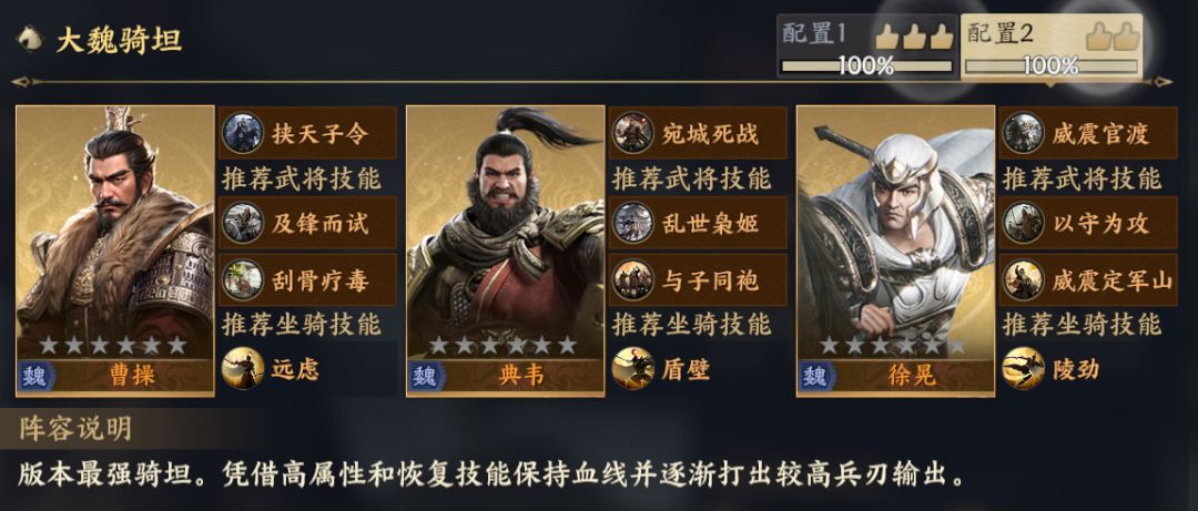 【兵法演练】中对于攻打敌军有时间限制,且在战斗结束后可以进入修整直接恢复兵力,因此法爆弓以及连击枪队伍在该玩法中会有比较大的优势;但在【黑山军玩法】中,由于讨伐黑山军没有时间限制, 且不同于【兵法演练】可中途撤出战斗修整恢复兵力,因此选择战中有兵力恢复且坦度高的阵容是比较合适的,如:骑坦队、法盾队!