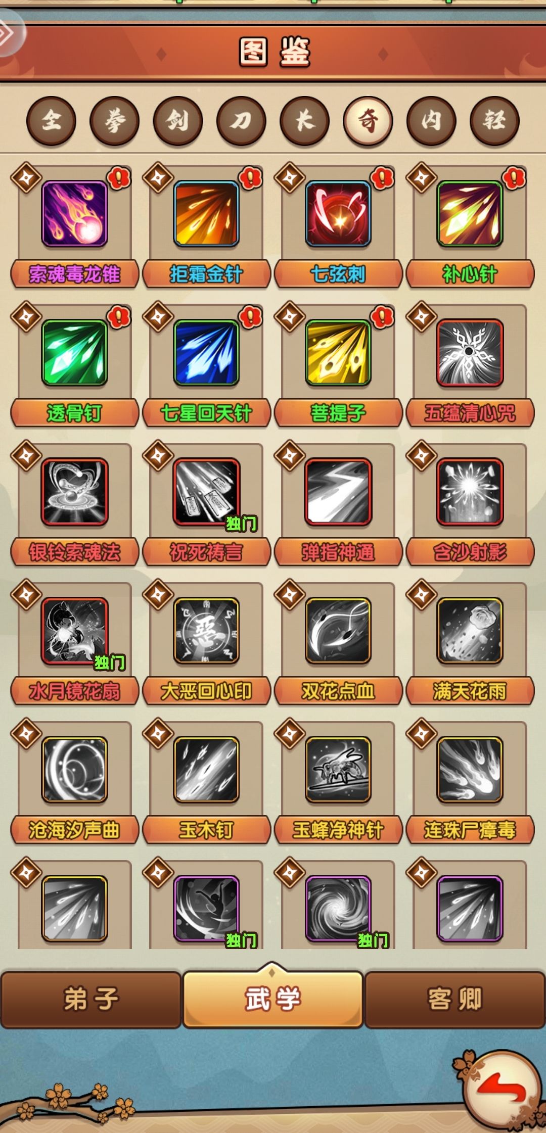 前期推荐漫天花雨(橙色全体攻击,武盟商店经常出现),落英护花针(全体回血),还有一个连毒(附加中毒效果,打蓝也挺好),紫色推荐弟子出云的倾奇舞(给队友加蓝),蓝色的还有一个玄学毒针(中毒打蓝)。