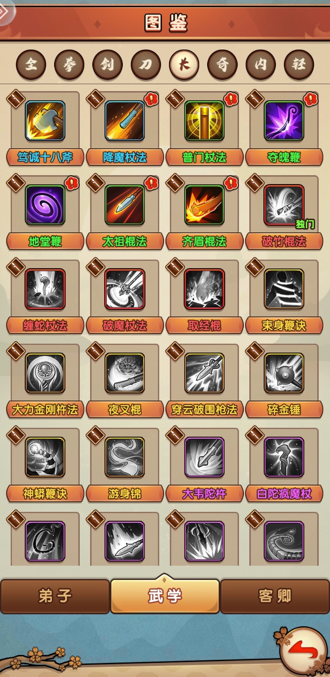 简评:长棍的特色很多,比如,白佗疯魔给混乱,夜叉棍给封脉,太乙枪、碎金锤降攻,中平枪法打蓝、蝎尾鞭中毒,都有各种各样的作用。
