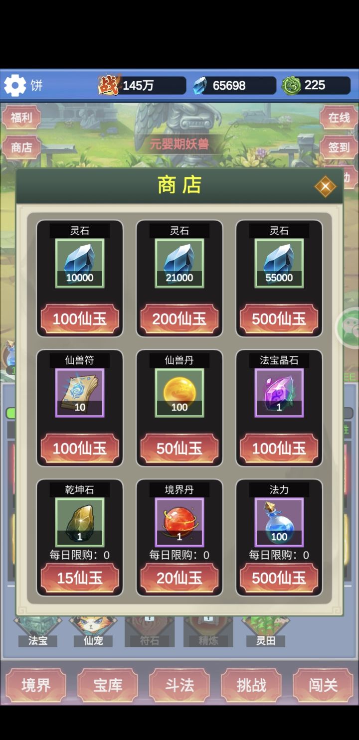 所以所有的资源都应该倾斜于购买法力其次进阶石,比如商场里最下面一排的限购,每日礼包里含体力值的礼包,灵田里的土地等等。