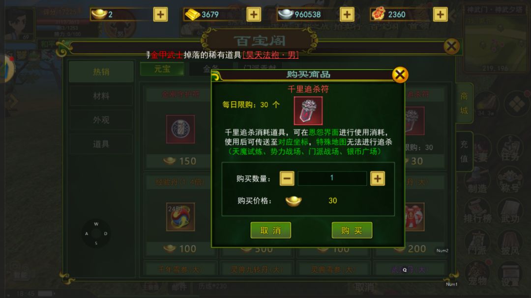 追杀符:可通过百宝阁元宝商城购买,30元宝一个,价格不是贵。千里追杀符相当于是一个追杀仇敌的传送符,当你的仇敌上线的时候,然后你就点击追杀,消耗一个千里追杀符会传送到你的仇敌的身边,特殊地图是无法追杀的(天魔试炼、势力战场、门派战场、银币广场】既然是复仇,那就要提升自己的实力,具体可以看完以前的攻略本期内容到期结束,谢谢各位少侠们阅览,玉风24区开服!福利多多!要一起玩的可以打在评论区或者私信小编,喜欢小编的可以点点赞和关注,我们下期再见!