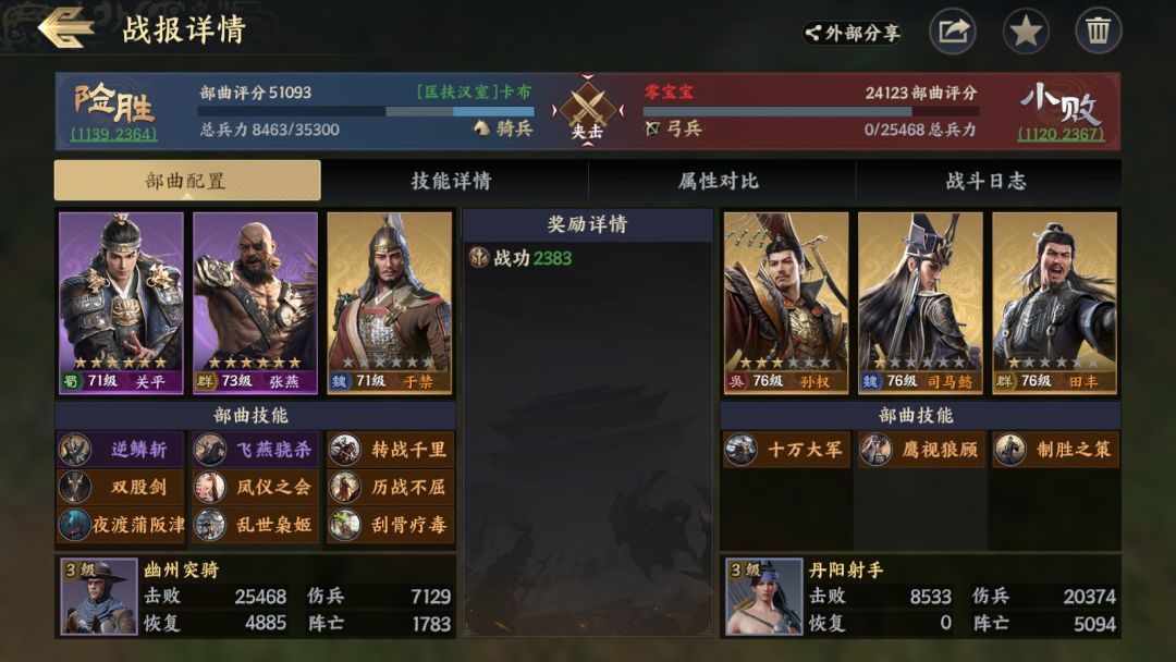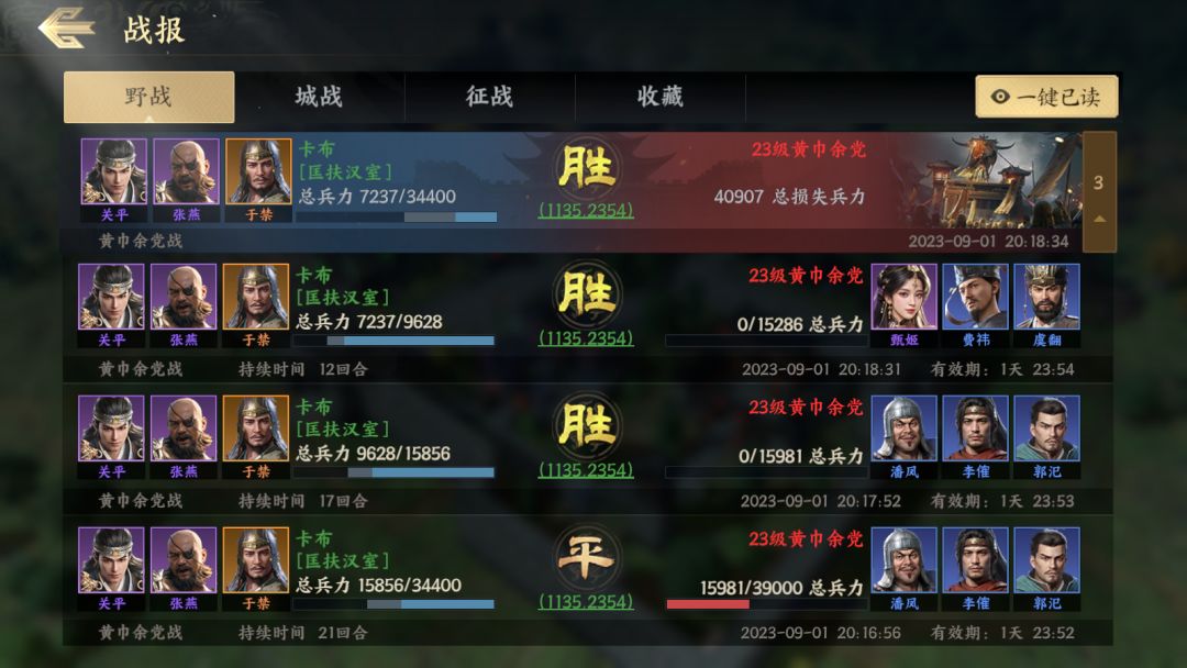 下图是黄忠换张燕(满星张苞更好)、曹操张辽于禁换成于禁张曼成(小刘备)加关平(半个张辽)组合战损变低了。