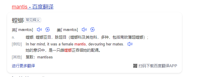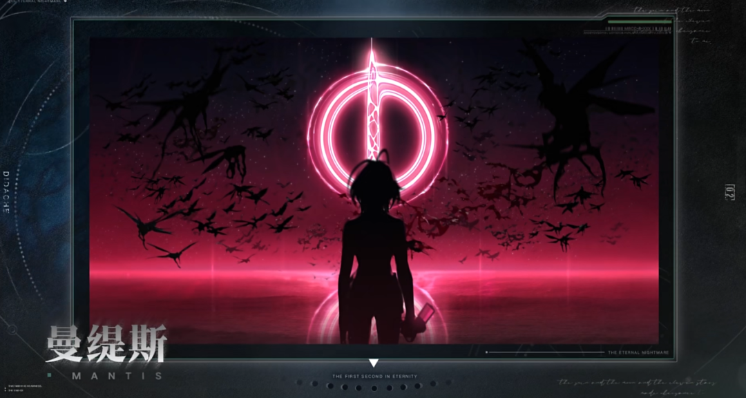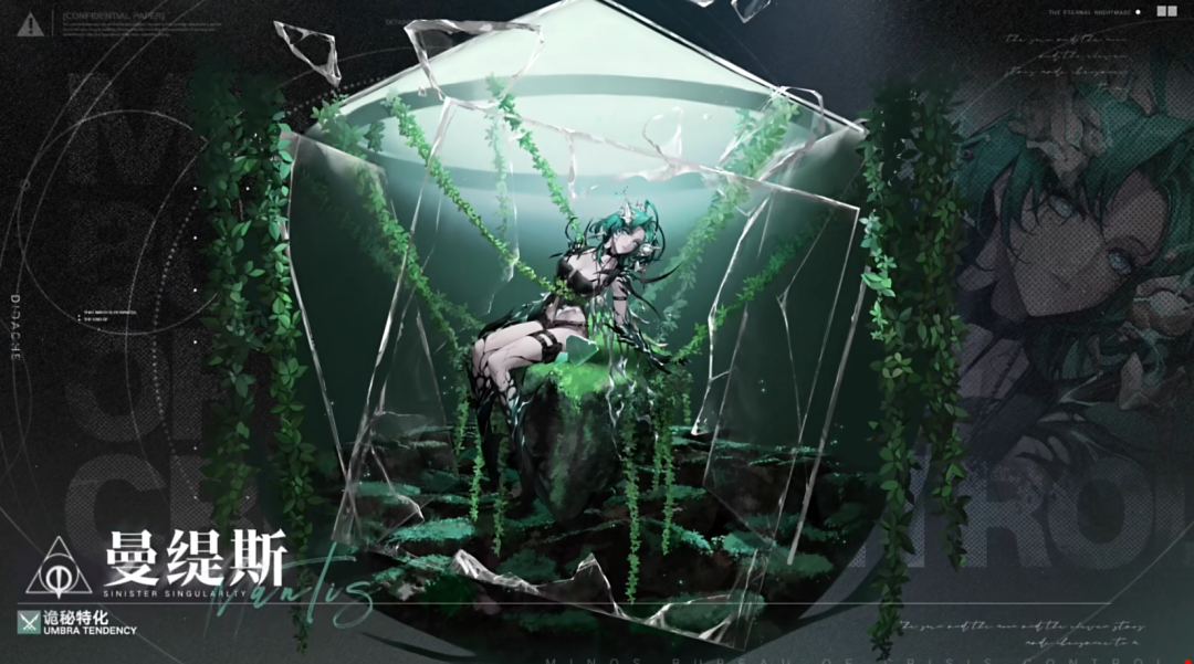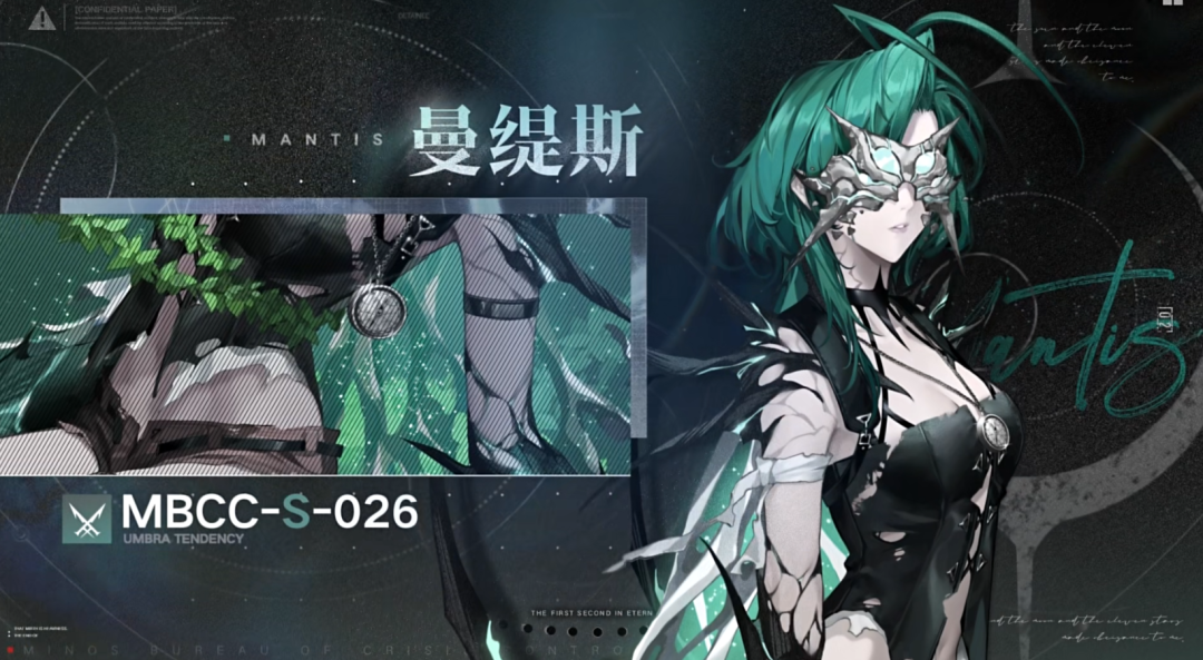 然后是新禁闭者的信息,狂级禁闭者曼缇斯(话说维一第一眼堪称曼妥思了......),其英文mantis的原意为螳螂,而无期迷途这款游戏在角色明明上很多时候也会用这类直译的方式来做,比如之前的卡门奈特(Cabernet)原意就是一种红酒的意思。