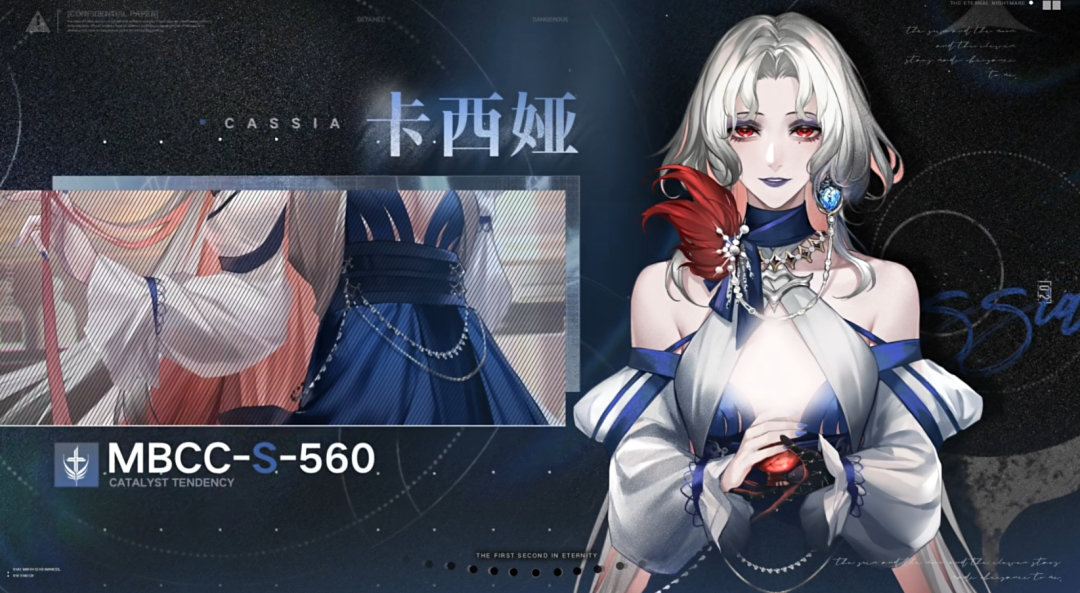 然后第二位是卡西娅,危级启迪角色,这眼影真是爱了爱了,不过按照目前危级角色一般都是上线即打酱油的节奏来看,大家就对卡西娅的外表观赏观赏即可,能力方面维一并不报有太高的期待。