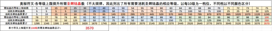 我利用测试服赠予的测试素材,将两个不同色的奥秘符文逐一升级,各级上限提升消耗素材并无差异,