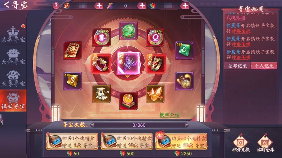 玩家累计寻宝360次必出大奖,若中途获得大奖,则会重置计寻宝次数。玩家获得的所有奖品都会寄存在临时仓库里,可随时取出。