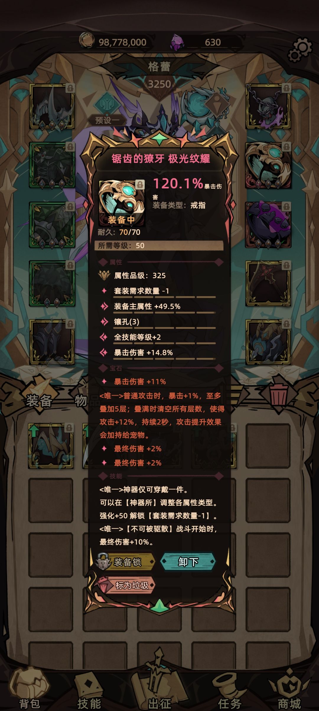 装备技能非常强大 并且带三孔 虽然大幅度的加攻在本攻略无用但是还是非常实用