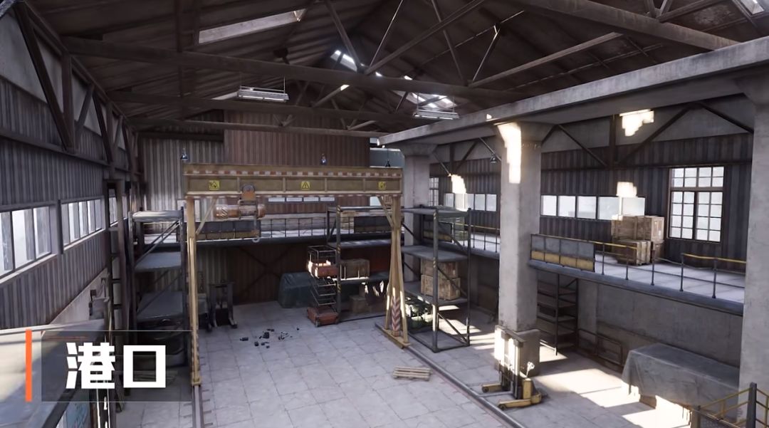 首先是港口区域的扩建和优化,主建筑不仅占地面积变大,还增加了厂房高度,使得内部空间显得更加明亮、开阔。此外厂房内还新增了二楼区域,让室内的战斗变得更为立体、复杂,此外还能通过玻璃窗对外架枪,辐射威胁周边区域。