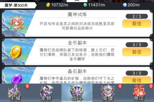 ● 战斗界面新增几个特殊副本,每天限定次数,随着难度的提升奖励会跟着提升