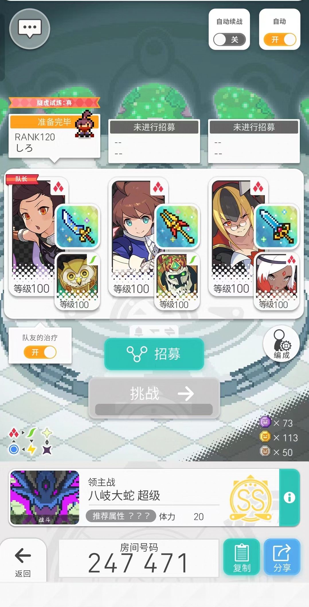 3)顶部左侧可以发送表情,目前只有8个。右侧是自动续战和自动战斗的开关。