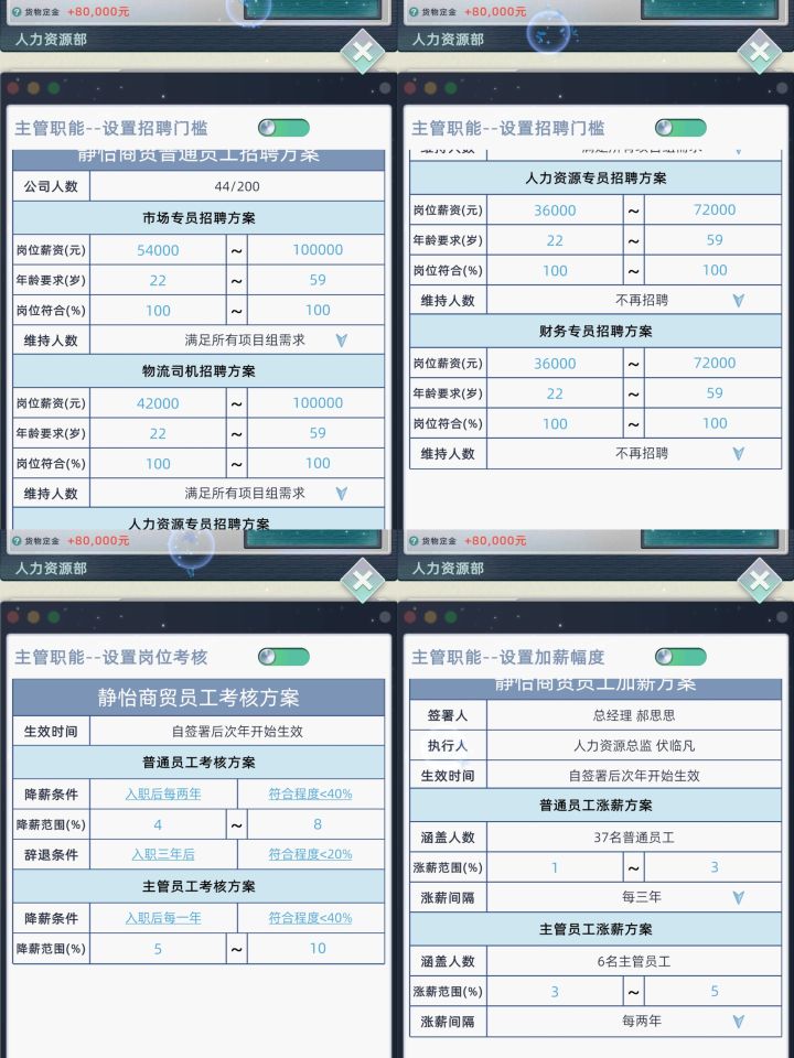 "市场专员"跟"物流司机" 薪资设置,最高十万虽然招聘难了点但是便宜呀你也可以加个一两万加速招聘,后面个薪资最高七万二(我都千万资产了🐦都不🐦他,直接招聘,让我没想到的是,居然还是有点难度,招聘不到人)