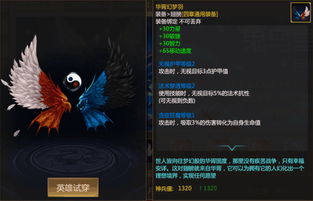 世人皆向往梦幻般的华胥国度,那里没有疾苦的战争,只有幸福安详。这对翅膀就来自华胥,它可以为拥有它的人幻化出一个理想境界,实现任何愿望。