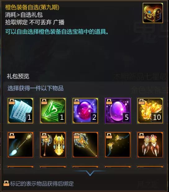 与金色装备自选(第九期)一样,在第九期的橙色装备自选中,同样增加了神之武器打造书页,其余的奖励均与第八期相同。