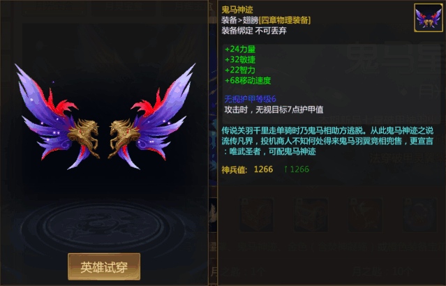 传说关羽千里走单骑时乃鬼马相助方才逃脱。从此鬼马神迹之说流传凡界,投机商人不知何处得来鬼马羽翼竞相兜售,更宣言:唯武圣者,可配鬼马神迹。