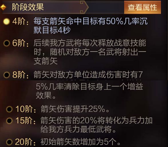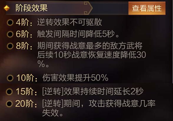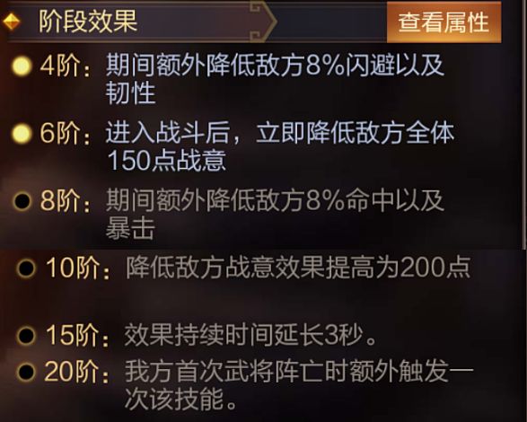 技能介绍:进入战斗后,随机选择1名敌方武将,对其添加8秒「颓败」效果,期间战意恢复速度降低42%,并且有50%几率额外多选择1个目标。