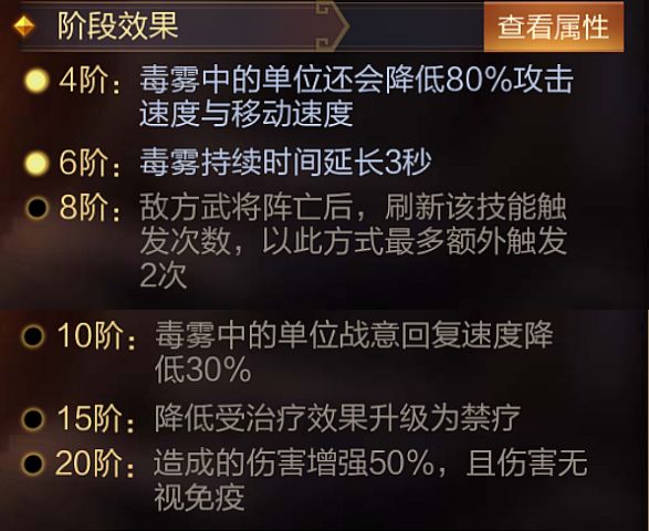 技能介绍:敌方首个武将兵力值低于40%时,对其造成我方攻击力最高武将252%+24000伤害,并在其脚下制造1格范围毒雾,持续5秒,毒雾中的敌方单位每秒受到48.39%+4607伤害,并降低30%受治疗效果(仅触发1次)。