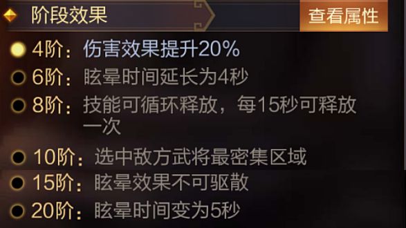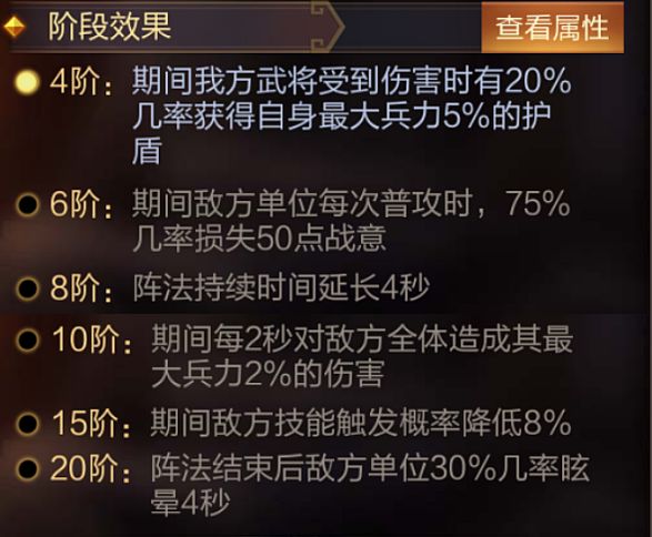 技能介绍:进入战斗后,在随机位置建造石门八阵,25.4%几率魅惑敌方全体(每个武将单独计算几率),石门八阵持续5秒。