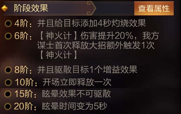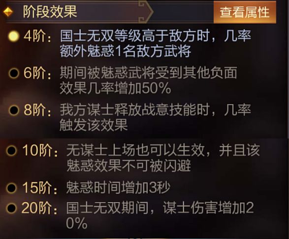 技能介绍:我方有谋士上场时,派遣少量谋士随机扰乱敌方一名武将,造成最大兵力23%+1400伤害,并魅惑5秒。