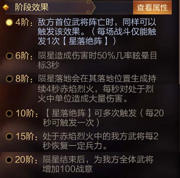 技能介绍:我方武将阵亡时,4秒内,召唤4颗陨星随机攻击敌方单位,对其以及1格范围内敌方单位造成127.7%+10200伤害(每场战斗仅触发一次)。