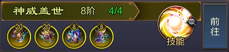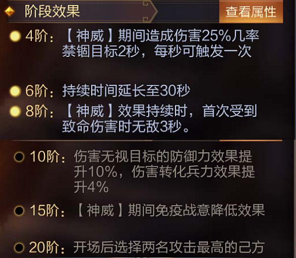 技能介绍:开场后为攻击力最高的己方武将添加「神威」效果,持续20秒,不可驱散,期间造成伤害无视目标13.4%的防御力,并将伤害的4.7%转化为自身兵力。
