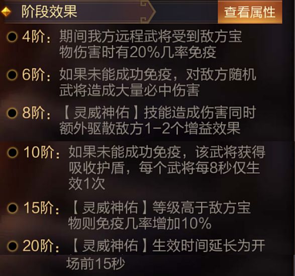 宝物解析:开局提升30%己方远程武将伤害减免。
